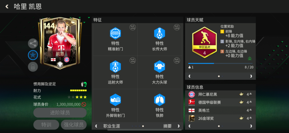 铁人、反越位大师、精准射门、天赋异禀、盘带大师、大力头球、外脚背射门、铁肺